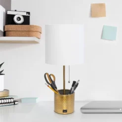 Hammered Metal Organizer Table Lamp With USB Charging Port And Fabric Shade – Simple Designs