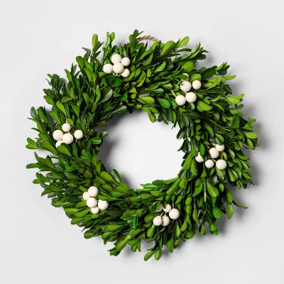 Bring a touch of earthy appeal to your seasonal display with the Preserved Boxwood Wreath from Sugar Paper™. Made from preserved boxwood, this petite full, leafy wreath is decorated with small clusters of white faux berries that beautifully complement its natural charm. The small 10.5-inch diameter makes it equally ideal for hanging on a door or wall or for creating an elegantly festive tablescape. A twine loop makes for easy hanging, while the simple design lends itself to styling as is or adorning with your choice of embellishments.