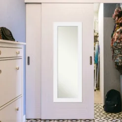 This 100% real wood, full-length Non-Beveled Mirror framed in the Corvino White frame, complements your decor without the need for unsightly over-the-door brackets. Individually made using traditional custom framing techniques, it has the quality you would expect from your local frame shop. It holds its value with premium finishing that can be appreciated up close. Our On The Door Mirror has two hooks to hang directly on your door or wall without additional anchors or brackets. Hang it on the back of a closet, bedroom or bathroom door, or on the wall as a standard full-length mirror. Because of our attention to detail and focus on artistry, architects, interior designers, and homeowners alike choose this mirror to create beautiful living spaces.