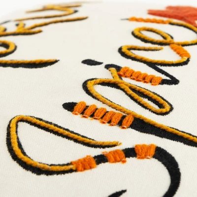 This pillow uses machine satin stitch embroidery for the lettering base. That base is then embellished using hand embroidery techniques. This gifts this pillow with a wonderfully artisinally crafted appeal. Heavy cotton yarns used in the hand embroidery gives this sentiment a crafted vibe a and brings wonderful texture and dimension to this pillow. A contrasting well in terra cotta frames this sentiment beautifully. This pillow features a matching solid cotton back with hidden zipper closure for ease of fill.