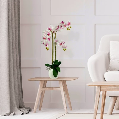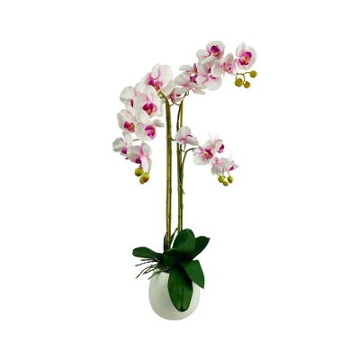 This 32-inch faux white orchid features delicate silk floral petals that feel real to the touch. Each petal shows a variation of color. The white orchids gracefully hang from each stem and provide an exquisite visual representation. Nestled in a solid black ceramic pot, the base of the orchid is surrounded by green foliage that embraces the beauty and realness of the flower. Perfect for the home or office, this faux orchid never needs watering and will remain fresh in appearance.