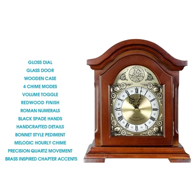 This lovely Mantel clock features a Redwood oak finish case and glass enclosure for the clock face. Rich and deeply colored it is timeless and exquisite. The dial is bright and perfectly brings forward the roman numerals for your ease. This classic Mantel clock is a stunning addition to any room, whether it is above a fireplace or on a desk. Has 4 chime modes and a volume control toggle.