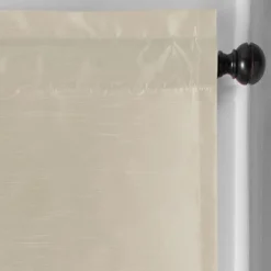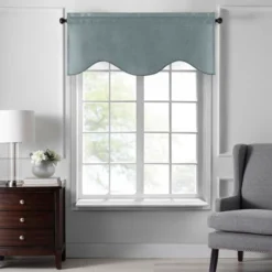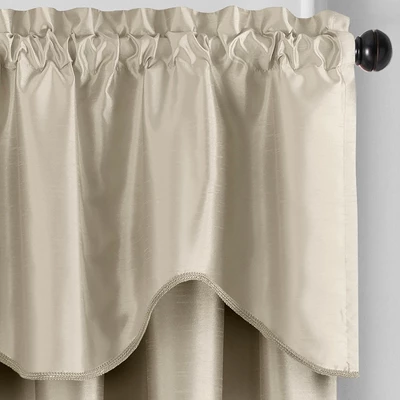 The Colette Scalloped Valance features a faux silk dupioni with luxurious sheen and rich texture. This upscale valance offers an aesthetic that can be traditional or transitional. Pair with coordinating panel, or hang valance alone. Rich solid colorways are chic, sophisticated and versatile. Simple and elegant gimp trim adds style and visual interest. 3 inch pocket is recommended with up to a 1 inch rod for maximum movement. 1.5 inch header adds decorative style. Valance measures 50”W x 21”L. 100% Polyester. Sold as a single, lined valance. Multiple valances may be needed to achieve desired look. Coordinating curtain sold separately. Easy care, machine washable.
