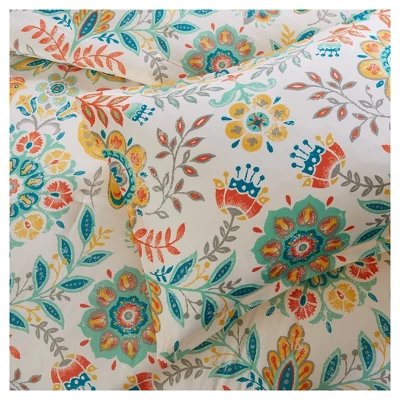 Update your bedroom with the warm and bright charm of the Eva Comforter Set. The soft microfiber comforter features a floral medallion and bird print in vivid colors with a solid reverse, for a pleasant boho look. The 2 matching shams (1 in Twin/TwinXL) pair perfectly with the motif of comforter to create a welcoming and colorful aesthetic. For the finishing touches, 2 decorative pillows coordinate with the top of the bed to complete the ensemble. This boho comforter set also uses an antimicrobial treatment that provides built-in freshness protection, reducing the growth of odor causing bacteria to keep fabric lasting longer.