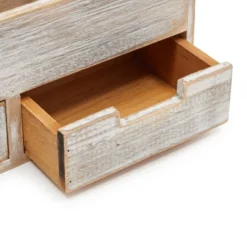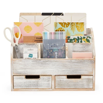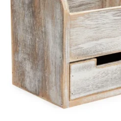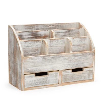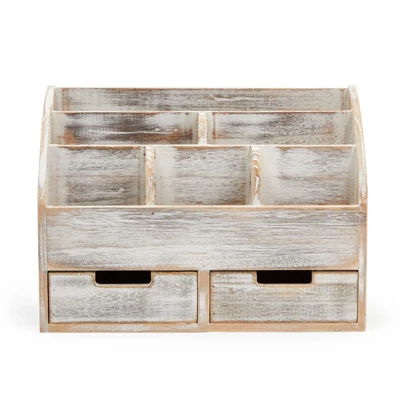 Keep your office supplies and stationery organized with this distressed torched wooden desk sorter that helps make any workspace look neat and tidy while offering a rustic-style look. This white desk organizer has 6 compartments, so you can organize pencils, pens, notes, letter-size documents, and other office supplies by category. It also has 2 drawers for other items. The sorter measures 14.5 x 10 x 6 inches.