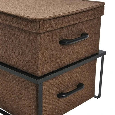 Stylishly streamline any living space with this thoughtfully crafted storage solution. Each set includes one open box which fits inside a sturdy metal frame and a second lidded box to stack on the laminate top. The textured linen like fabric is more luxurious and durable than standard fabric storage boxes. These storage boxes are a great storage solution to utilize on bookcases, desk tops, and closet shelves. Make use of these boxes to organize and protect clothing, file papers, office supplies, and other miscellaneous items. Each box folds flat for storage when not in use and is easily assembled when ready for use.