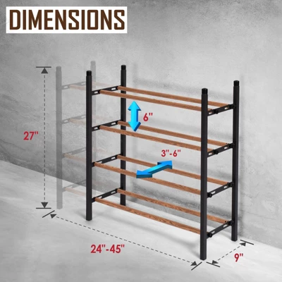- Smart Space-saving Solution: Keep shoes off the floor and odd places. With adjustable level width at 3”-6”, it is intended for both kids and adult’s sneakers, stilettos, slippers, high heels, and various footwear. Expandable rack can be extended to 45” in length storing up to 24 pairs of shoes.