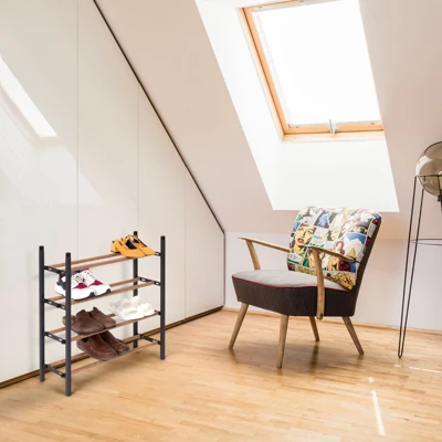 4-tier shoe rack is a smart and modern space saving solution for any homes. Keep shoes off the floor and odd places. With adjustable level width at 3”-6”, it is intended for both kids and adult’s sneakers, stilettos, slippers, high heels, and various footwear. Expandable rack can be adjusted to a lengthier rack storing up to 24 pairs of shoes. Stackable design allows customization easily any time. Originally comes with 4 levels. Just stack extra levels to accommodate more shoes maximizing vertical space for greater capacity. Non-slip design keeps shoes in place. Strong structure with high quality heavy metal tube create a stable framework that won’t topple over. Sturdy, durable, and rust-free, shoe organizer is guaranteed to last you for a long time. Matte black powder coating finish combined with metal dressed up in oak grain, it is both elegant and stylish to imbue homes with a contemporary minimalistic vibe. Can be placed on entryways, coat room, living room, hallways, garage, mud room, walk-in closets and even inside the wardrobe. Large screw design makes assembly easy and convenient using only hands. No extra tools needed. Just read through the assembly instructions to be all set in just a few minutes. Easy to clean. Simply wipe with cloth and cleaning agent. Package includes: 1 x shoe rack, 1 x instructions. Dimensions: 24″ L x 9″ W x 27″ H. Level width: 3” – 6”. Level distance: 6”. Extendable up to 45” in length. Weight: 6 lbs.