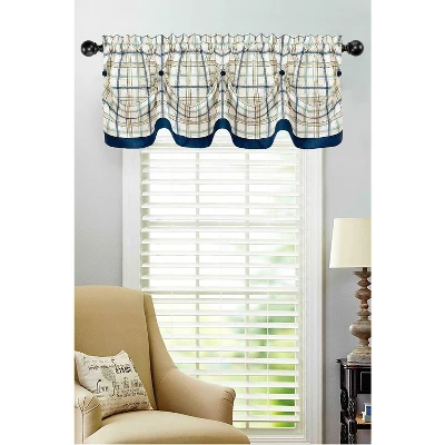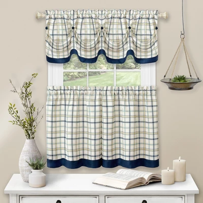 Introduce a charming farmhouse accent to your home decor with this Tattersall Kitchen Window Curtain Tier & Valance Set. Made from a light-filtering polyester cloth, these curtains feature a plaid design with fabric-covered button embellishments.