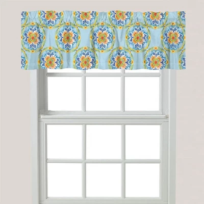 Bright colors, striking patterns, and floral details make the “Talavera” window valance a ‘don’t miss’ home accessory. The lively watercolor design is complemented by a tranquil blue background. It’s perfect for any room in your home.