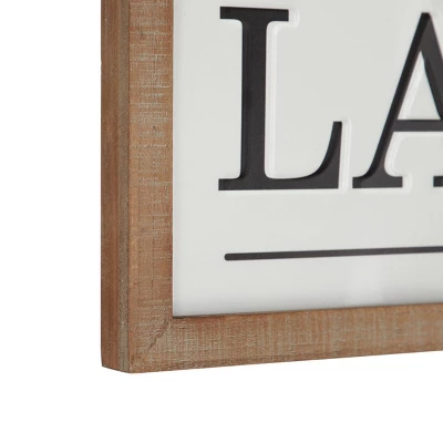 - •This farmhouse laundry wall sign carries a white panel detailed in black and housed inside a brown wood frame