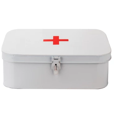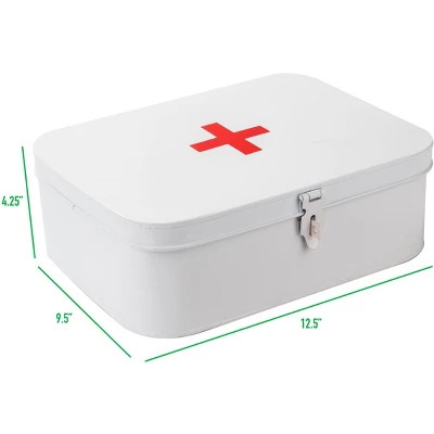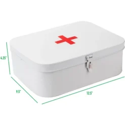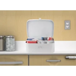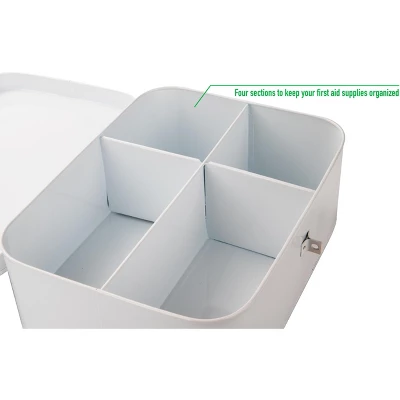 Keep your health supplies handy with Mind Reader Products first aid storage containers. Make sure that you can always find the bandage or ointment you need, exactly when you need it. This convenient container from Mind Reader collects and protects your first aid supplies (supplies not included) from prying hands, dust, sunlight, moisture, and other damaging elements, keeping them gathered together while saving space. The latching lid helps to secure and protect your supplies from spilling out, getting lost, or from unwanted reach. (Buckle clasps do not guarantee against unwanted access and should not be confused with locks.) The built-in dividers for inside the container provide additional compartmentalization for sorting and organizing your supplies. The glossy red and white color scheme sets itself apart and can be easily spotted among clutter, while the durable, lightweight galvanized steel construction protects the contents from damage. This ultra-portable container makes a perfect addition to your medicine cabinet, linen closet, cupboard, or trunk of your car. Fill it with your essential medical supplies, first aid necessities, bandages, or even vehicle emergency items, and put it somewhere safe for use in any emergency situation. Keeping all your first aid supplies in one spot can help you feel more prepared in the unfortunate case of an emergency, or just when you need to find a band-aid quickly. Practice your preparation with a first aid storage container from Mind Reader Products. Dimensions: 9.5″ L x 12.5″ W x 4.25″ D Materials: Galvanized Steel