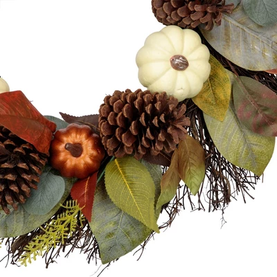 Add a touch of nature to your decor, with this festive autumn wreath. This harvest wreath captures the feeling of the outdoors for your Thanksgiving holiday. You can place this wreath on your walls, doors, and above your mantles in your home or office. Product Features:Autumn harvest Thanksgiving unlit wreathPumpkins, gourds, pinecones and leaves Designed with brown, green, cream and gold colorsNatural grapevine circular twig base for easy hangingDesigned with a jute rope for easy hangingRecommended for indoor use onlyNo assembly required – wreath comes in 1 pieceDimensions: 24″ diameter (measured from outermost tip/edge to outermost tip/edge across the wreath) Inner diameter: 9″ diameter Material(s): grapevine/plastic/polyester/foam/jute