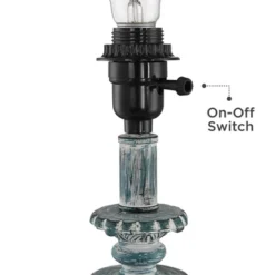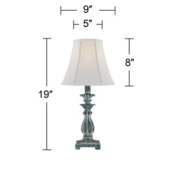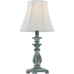From Regency Hill, these traditional accent table lamps come in a convenient set of two. Each lamp has an elegant candlestick inspired frame, with worn carvings for a more elaborate design. An antique blue finish is rubbed on to give it an aged look. White bell shades on top are the perfect finishing touch to this beautifully old-fashioned design.