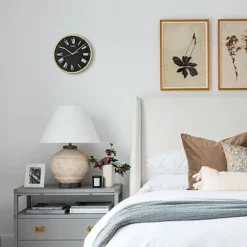 - Stylish golden frame enhances the black clock face and white roman numerals.