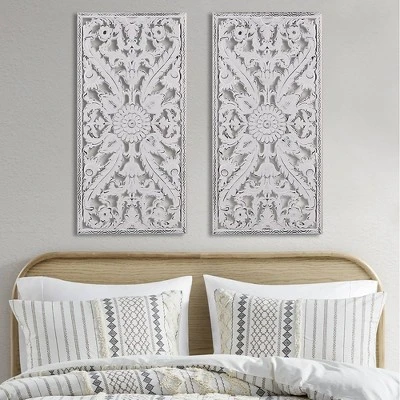 Complete your home decor with our Madison Park Botanical Panel Distressed Carved Wood 2-piece Wall Decor Set. This wall decor set features exquisite carved global botanical designs in a durable MDF material creating beautiful texture and dimension, while a white washed finish adds a unique vintage touch. Each piece is finished with two D-rings on the reverse making it easy to hang pieces, either side by side for a more clean look or staggered for a more stylized approach. Perfect for any Living Room, Dining Room, or Entry way – this carved wood panel 2 piece set is the perfect elegant touch to any decor.