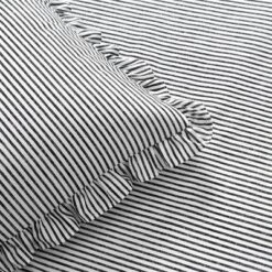 This Ticking Stripe Bedspread Set is very trendy. The classic pinstripes printed on the front never go out of style, and the ruffled edges are very chic and stylish. The Ticking Stripe Bedspread Set, which is available in soft neutral colors to create a calming atmosphere, features a stunning, fashionable look to brighten any bedroom or dorm room. Because it is lightweight, it is ideal for layering and for use during the spring and summer. In warmer climates, it can be used year-round. This Ticking Stripe Bedspread Set is sure to impress all your guests with the incredible amount of special details that are incorporated in the design. Its generous size will create the beautiful overhang look for a more glamorous feel. From a child’s bedroom to your own master bedroom, this Ticking Stripe Bedspread Set is ideal for use for all ages. Give your daughter a lovely first big girl bedroom or update your teenager’s bedroom into a princess palace. This set would even look fabulous in dorm rooms, guest bedrooms and master bedrooms. The Ticking Stripe Bedspread Set is available in four sizes. The Twin size is a 2-piece set which includes a soft and luxurious bedspread and one matching pillow sham. The Full, Queen and King sizes are 3-piece sets which include the bedspread and two matching pillow shams. Due to the delicate nature of the ruffles, we highly recommend that you dry clean this bedspread as well as the shams. Oeko-Tex Certified.